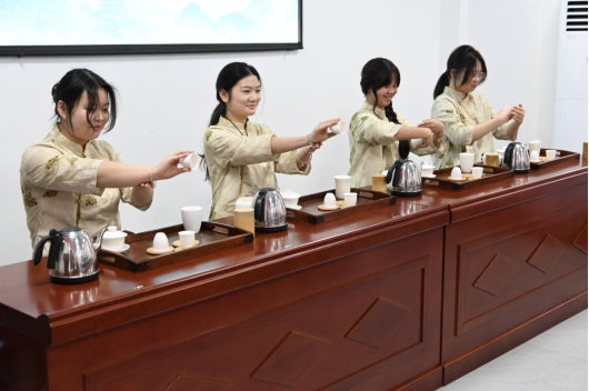 仪式后,工商管理学院茶酒社进行了精彩的技能展示,同学们身着茶服向现场社区人员展示了娴熟技艺,共同营造出茶香缭绕的文化氛围。
