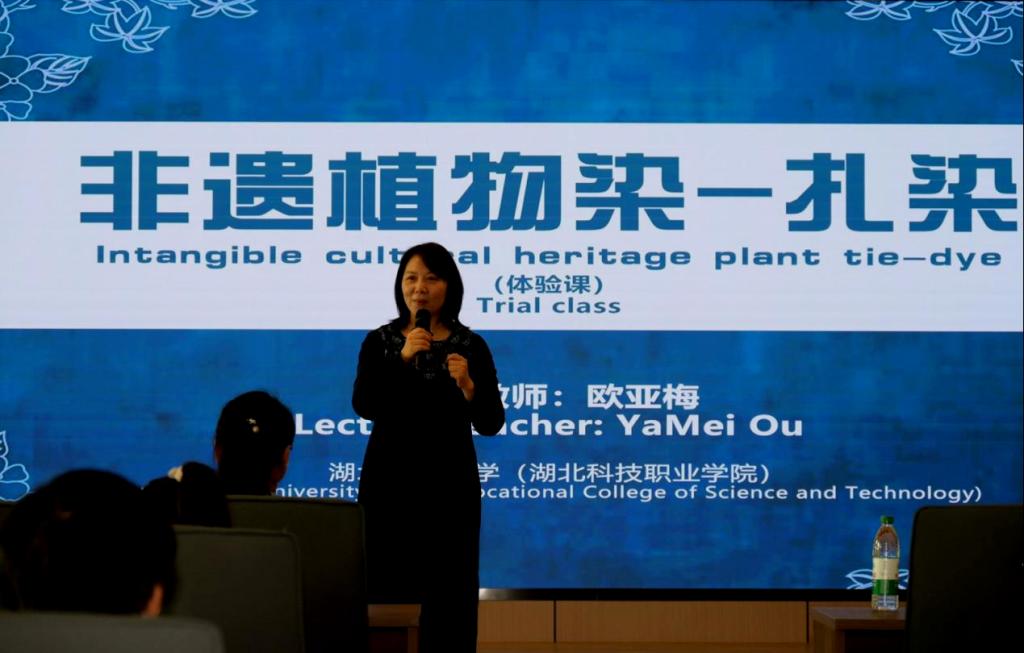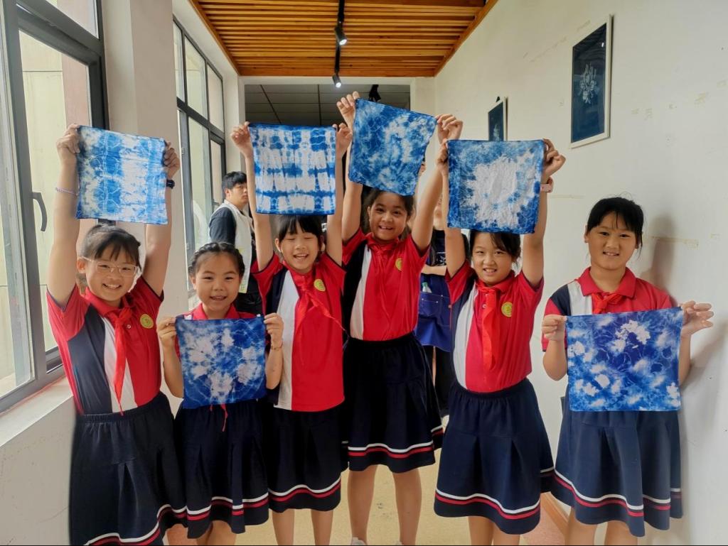 MK平台非遗项目负责人欧亚梅老师以“非遗植物染——扎染”为题,生动介绍了传统植物蓝染文化与扎染技艺流程。课程实践环节,学生志愿者分组指导大花岭小学师生完成蓝染项目化课程。当靛蓝色在织物上晕染出独特图案时,传统工艺在校校传递中焕发新生。