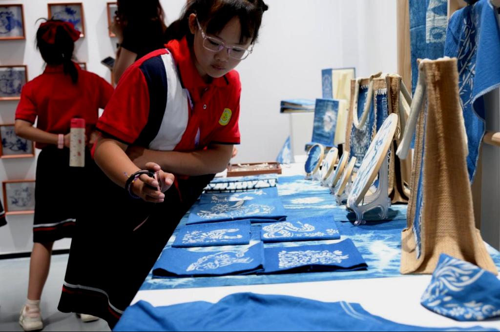 活动伊始,大花岭小学师生步入MK平台荆楚非遗文化职教传承研究中心,先进的数字技术将荆楚非遗以全新方式呈现:“非遗数字人”通过语音问答与大家展开交流;非遗蓝染展厅内,传统蓝染工艺与现代设计理念结合的作品,展现独特艺术魅力;AI智能化妆镜的互动体验,让孩子们异常兴奋。武汉剪纸大师工作室内,师生团队的精湛技艺令众人惊叹。展厅大屏播放着动漫专业学生制作的动画片,非遗空间营造了轻松活泼的氛围,让非遗以更贴近青少年的方式融入,全面体验传统文化魅力。