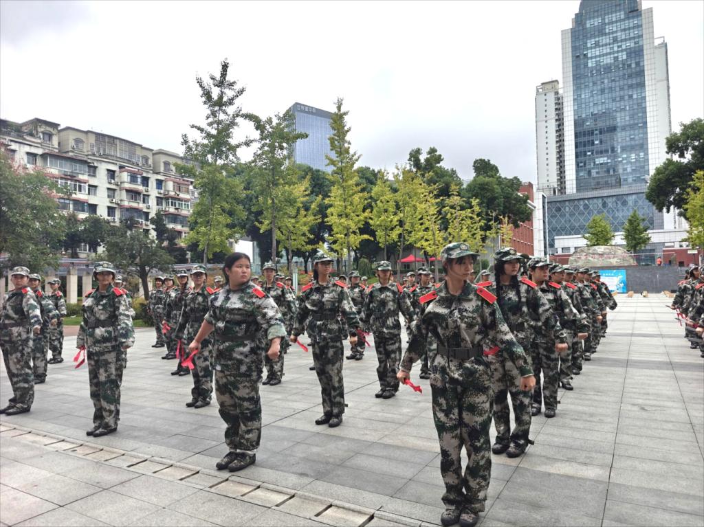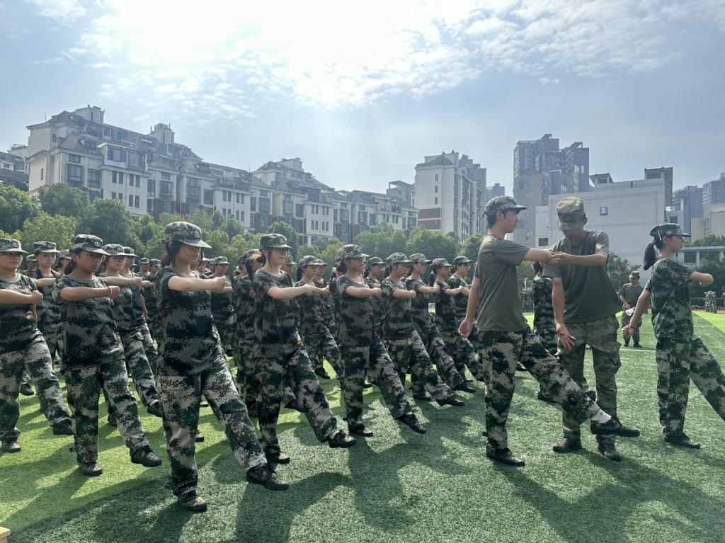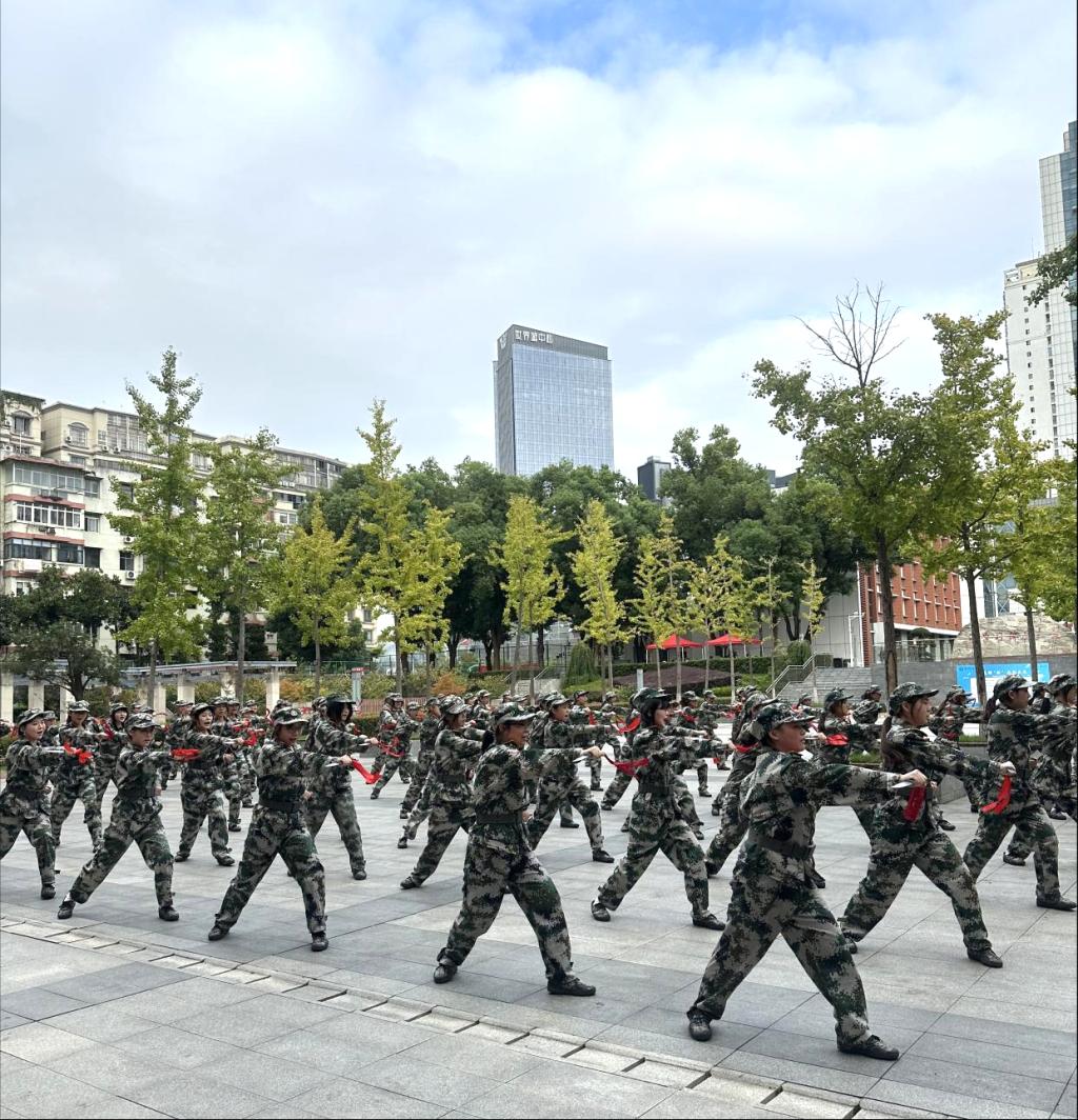 艺术创意学院的100人匕首操连,是军训场上当之无愧的“硬核”力量。训练中,同学们以“高标准、严要求”攻克握刀姿势、刺杀动作、队列协同等重难点:出刀时利落干脆,寒光映着坚定眼神;摆阵时默契配合,动作的力量与韵律完美融合。酷暑下,汗水顺着手臂滴落在训练场,却没人停下动作;重复训练中,手臂酸痛难忍,却没人喊过放弃。这支匕首操连,用汗水彰显坚韧,用协作凝聚力量,既成为军训场上的亮眼风景,更展现出湖科巾帼的飒爽风采与奋斗精神。